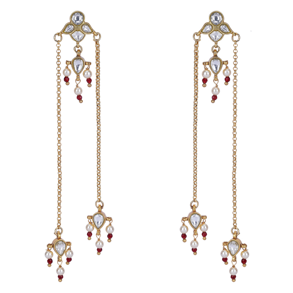 Details Size : Earring L- 4"X W-.03" Stone Setting : Kundan String(s) : Drop(s) : Ruby Finish : 22k Gold Plated Finding : Push Back Art Karat Jewelry is plated with 22k gold, studded with precious, semi-precious and natural gemstones....