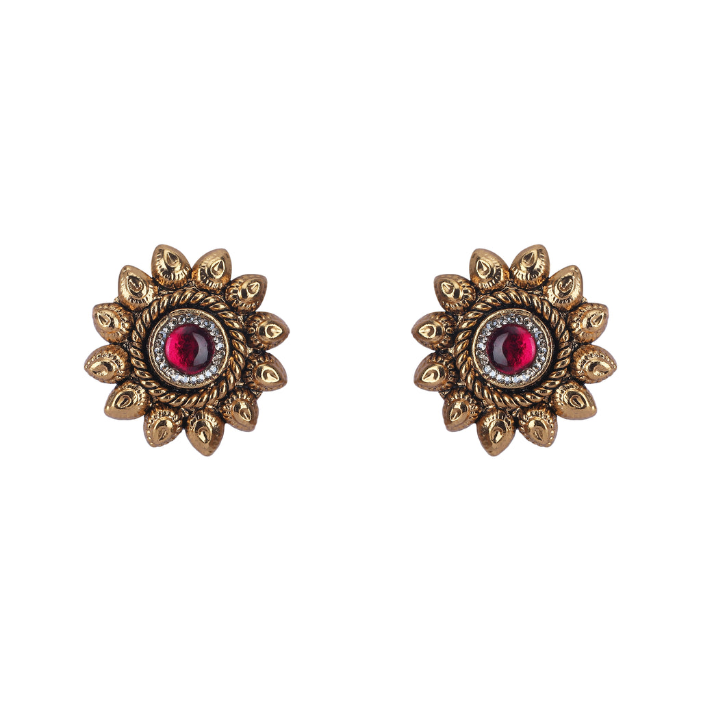Details Size : Necklace L-9" X W-1" Earring L-1.2" X W-0.3" Stone Setting : Ruby String(s) : Drop(s) : Finish : Gold Plated Finding : Dori &Push Back Art Karat Jewelry is plated with 22k gold, studded with precious, semi-precious...