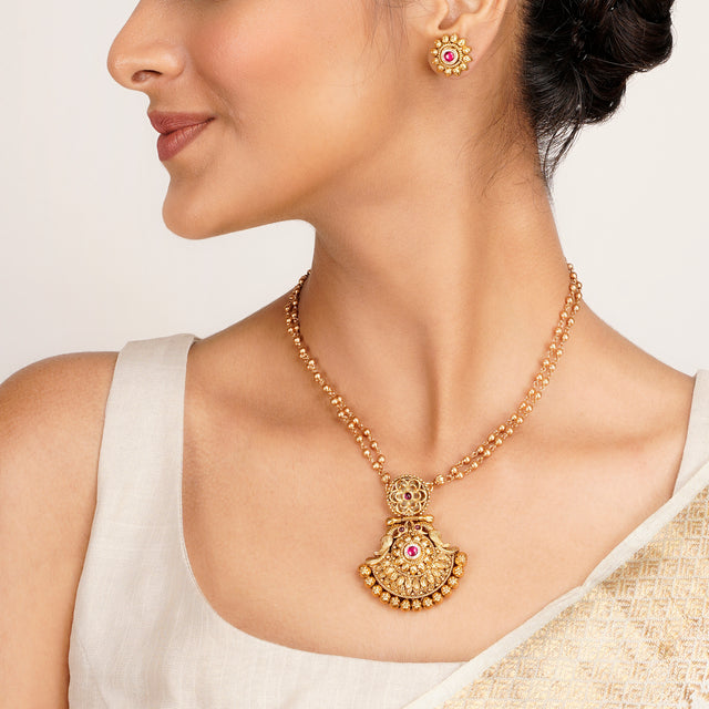 Details Size : Necklace L-23" X W-2.2" Earring L-1.5" X W-1" Stone Setting : Ruby String(s) : Fresh Water Pearl Drop(s) : Finish : Gold Plated Finding : Hook Link& Push Back Art Karat Jewelry is plated with 22k gold,...