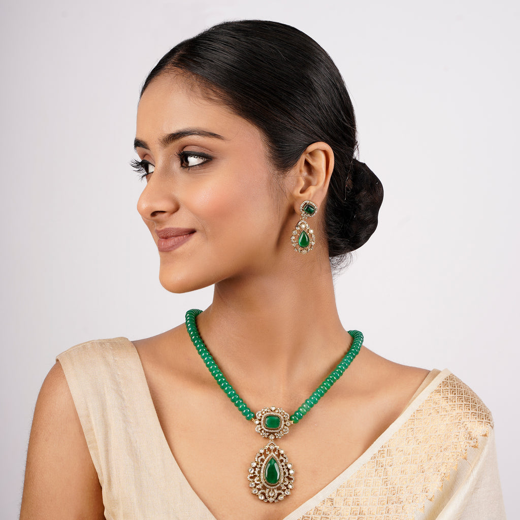 Details Size : Necklace L-10"Xw-.05" Earring L-1.1"XW-0.2" Stone Setting : String(s) : Drop(s) : Gold Beads Finish : Gold Finding...