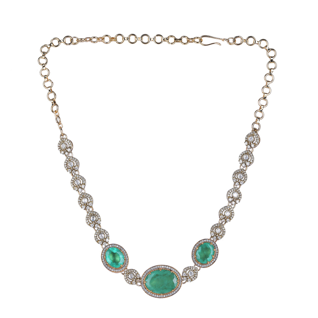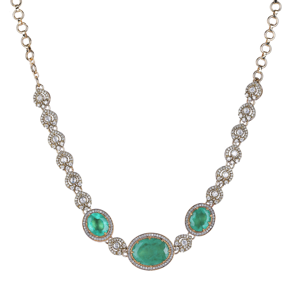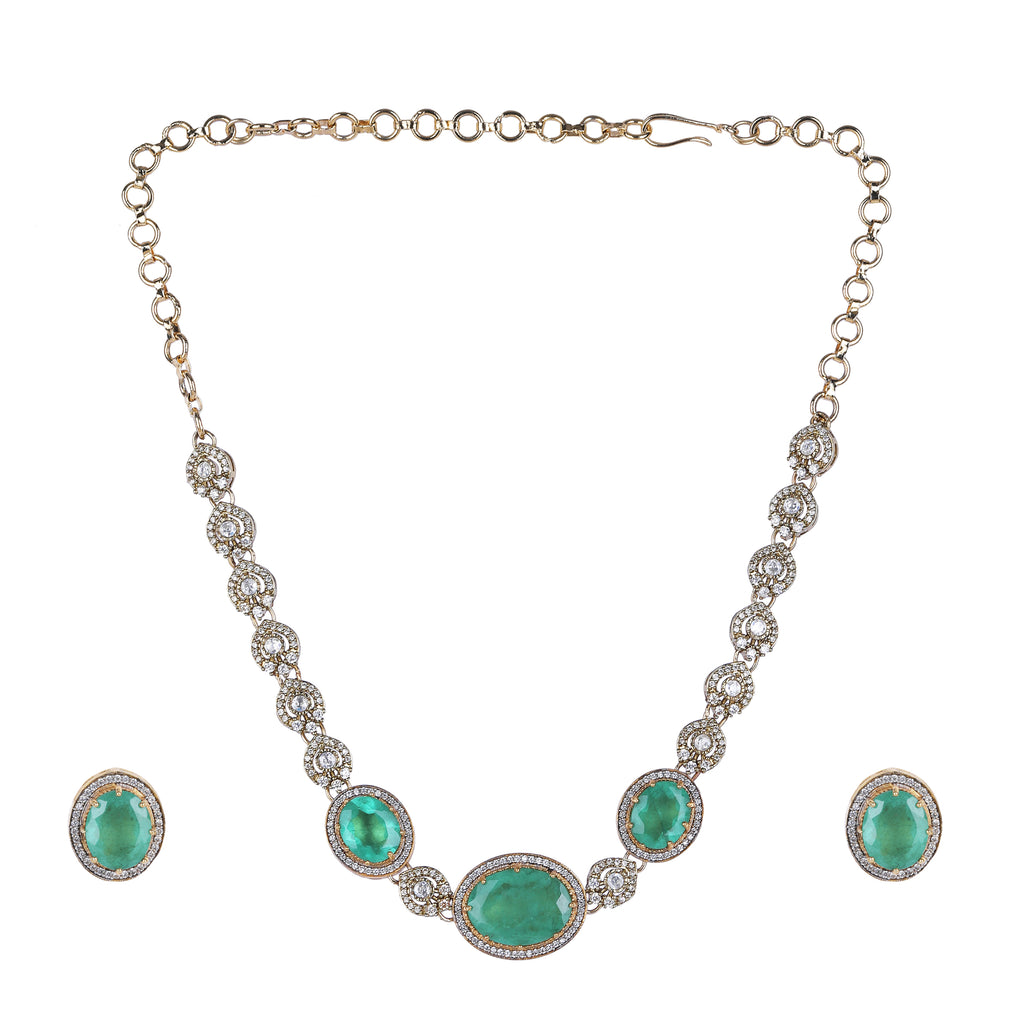 Details Size : Necklace L-12"XW-2.5" Earring L-1.8"XW-0.7" Stone Setting : Zircon String(s) : Drop(s) : Finish : Gold Finding : Hook Link...