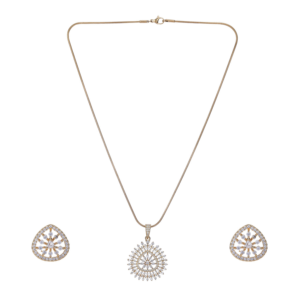Details Size : Pendant L- 19"XW 0.8 " Earring L-0.7"XW .05" Stone Setting : Zircon String(s) : 22K Gold Plated Chain Drop(s) : Finish : 22K Gold plated Finding : Hook Link&Push Back Art Karat Jewelry is plated with 22k...
