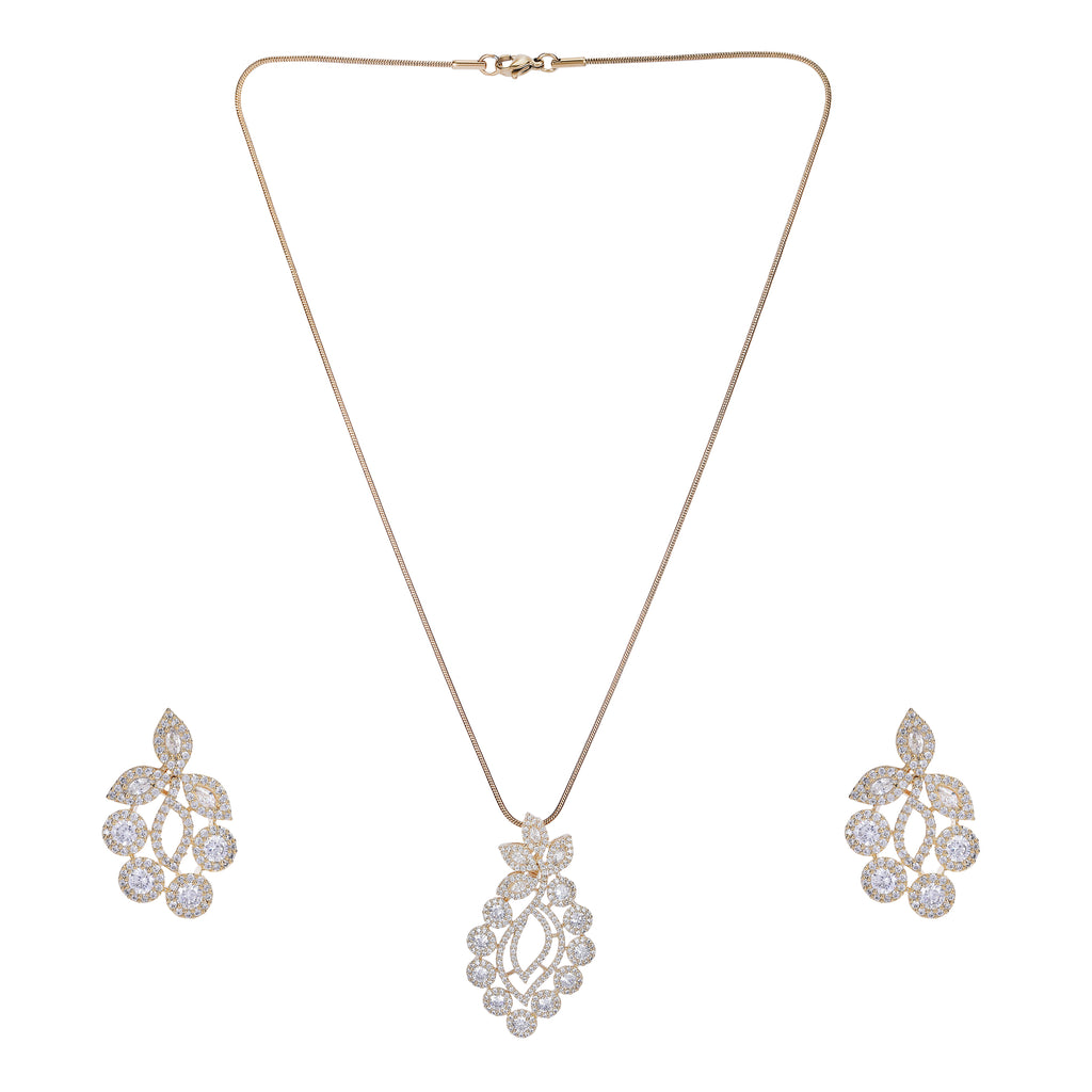 Details Size : Pendant L- 21"XW 1 " Earring L-2"XW .05" Stone Setting : Zircon String(s) : 22K Gold Plated Chain Drop(s)...