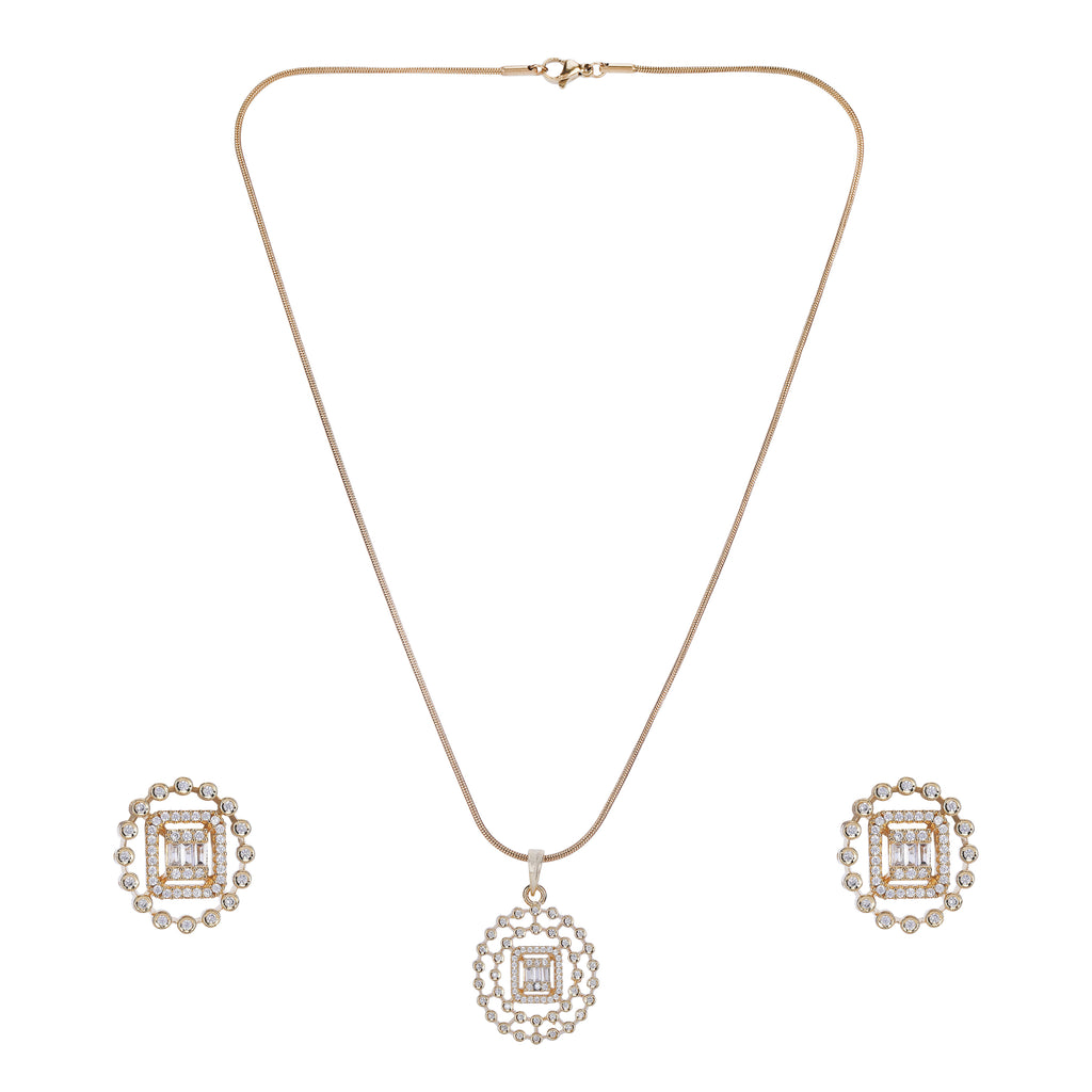 Details Size : Pendant L- 18"XW 0.8 " Earring L-0.6"XW .06" Stone Setting : Zircon String(s) : 22K Gold Plated Chain Drop(s)...