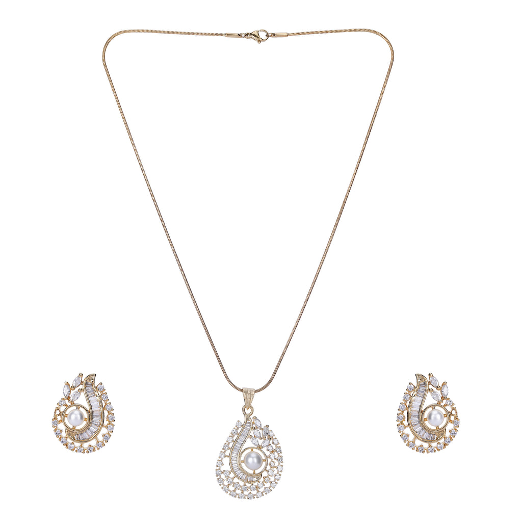 Details Size : Pendant L- 19"XW 0.8 " Earring L-0.7"XW .05" Stone Setting : Zircon String(s) : 22K Gold Plated Chain Drop(s)...