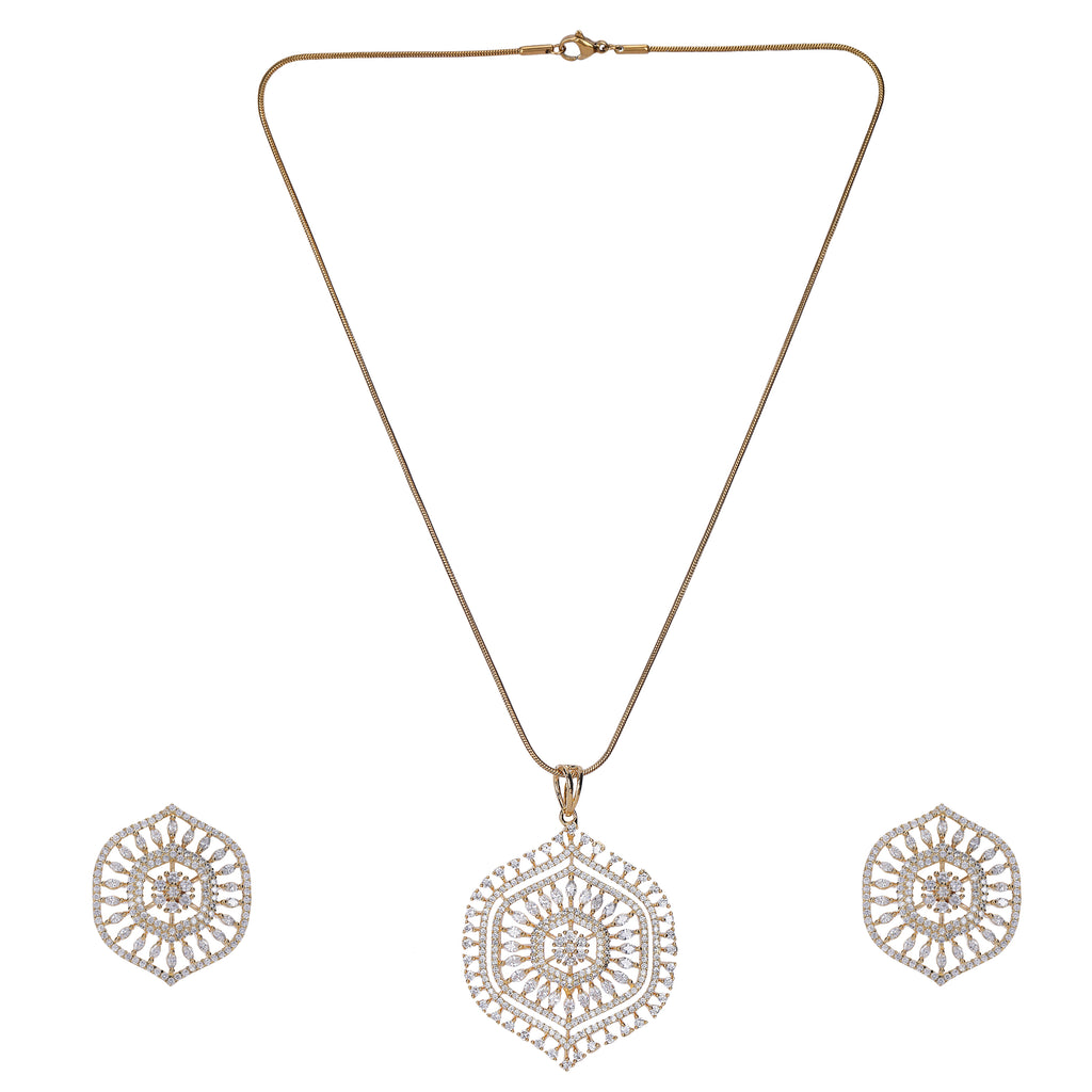Details Size : Pendant L- 18"XW 0.8 " Earring L-0.6"XW .06" Stone Setting : Zircon String(s) : 22K Gold Plated Chain Drop(s)...