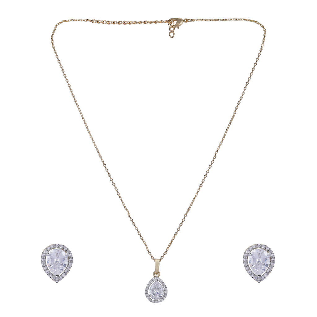 Details Size : Pendant L- 18"XW 0.8 " Earring L-0.6"XW .06" Stone Setting : Zircon String(s) : 22K Gold Plated Chain Drop(s)...