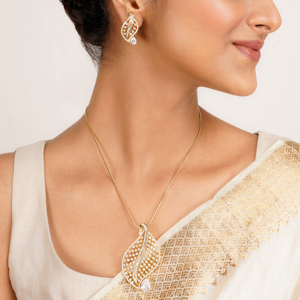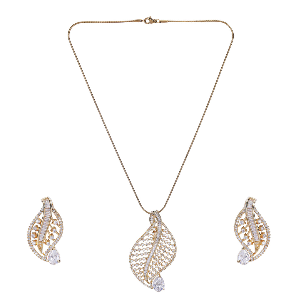 Details Size : Pendant L- 21"XW 1 " Earring L-2"XW .05" Stone Setting : Zircon String(s) : 22K Gold Plated Chain Drop(s)...