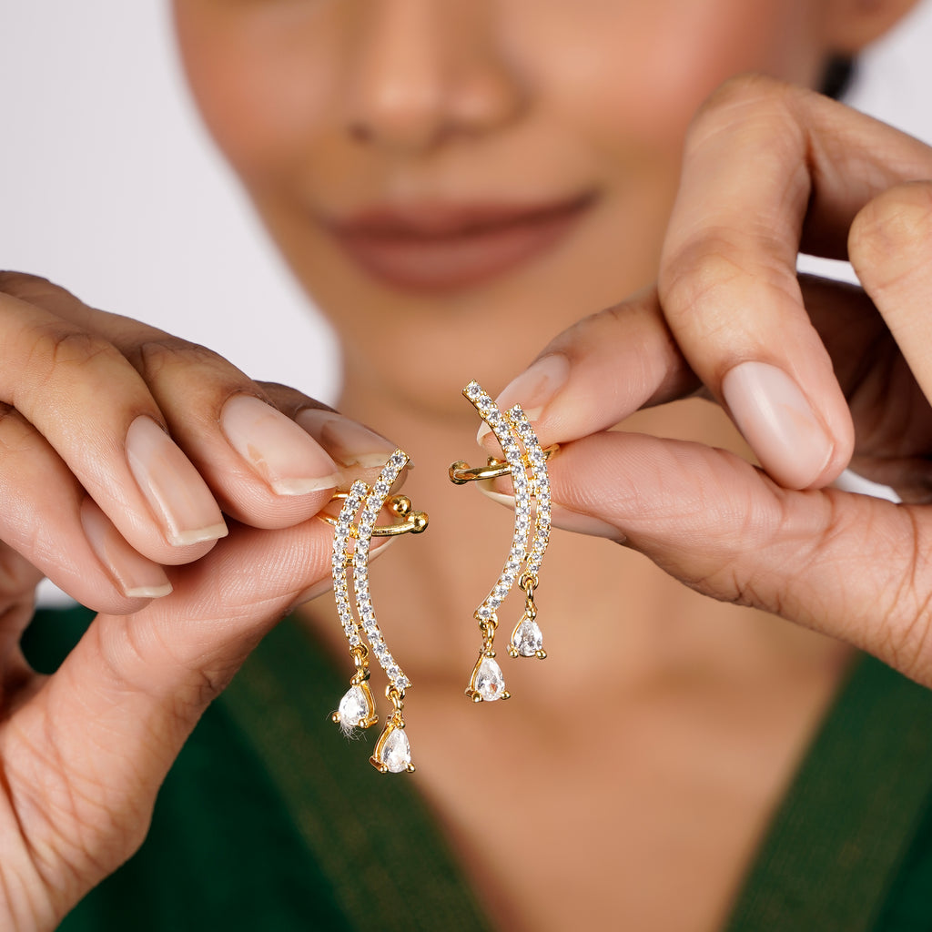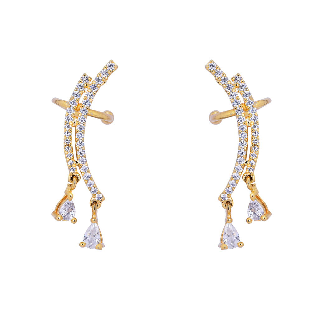 Details Size : Earring L-1.1"XW 0.2" Stone Setting : Zircon String(s) : Drop(s) : Finish : 22k Gold Plated Finding...