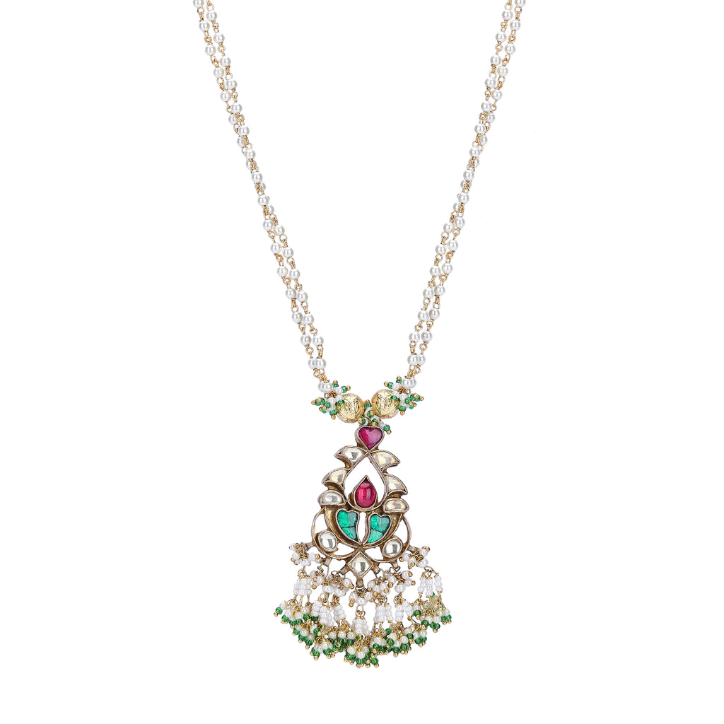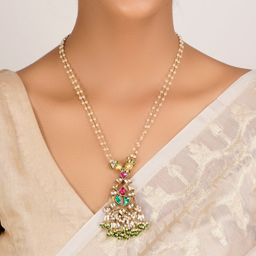 Details Size : Necklace L-21" X W-.1" Earring L-1.5"XW- 0.4" Stone Setting : Kundan String(s) : Taarmoti Drop(s) : Fresh Water Pearl...