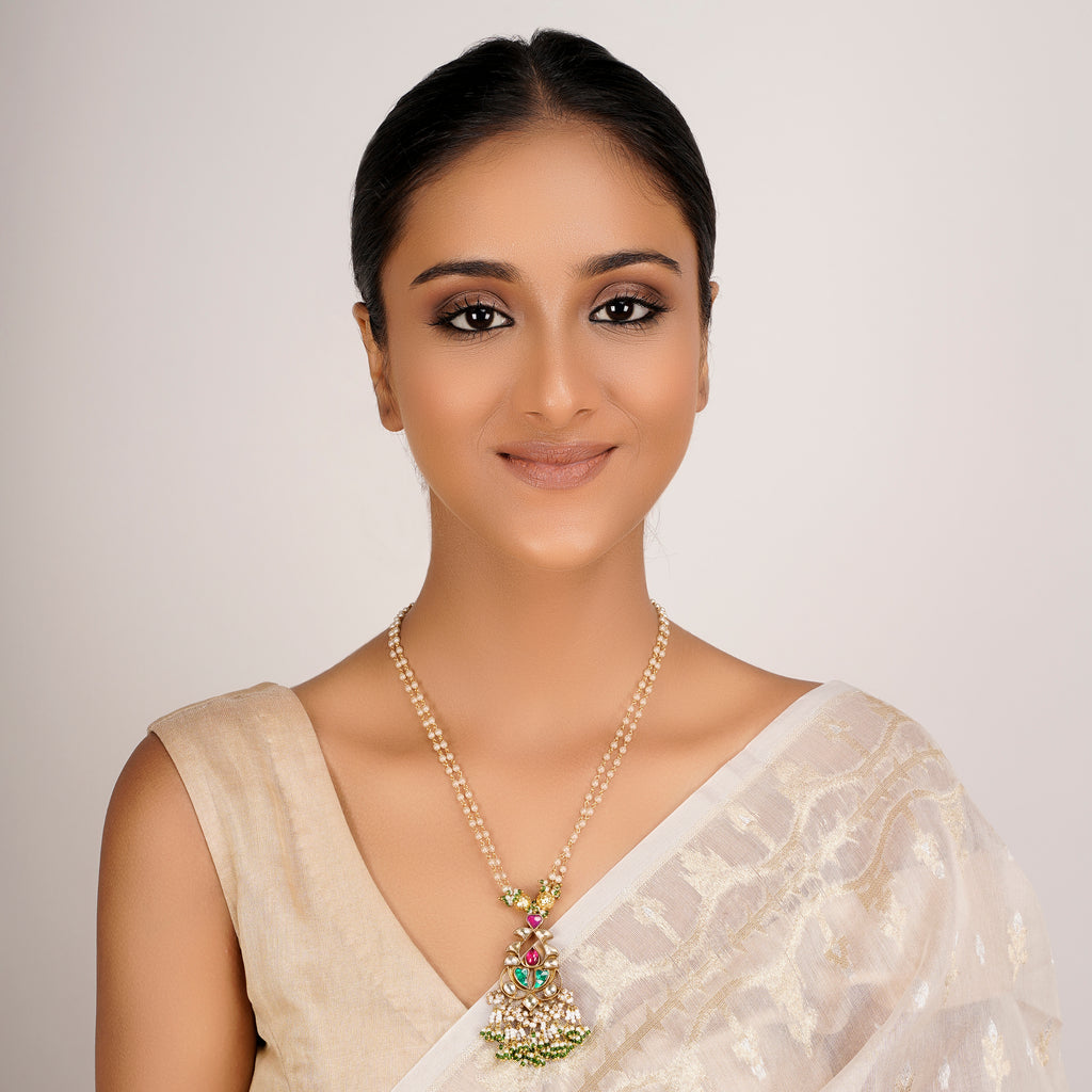 Details Size : Necklace L-22" X W-1.3" Earring L-1"XW- .2" Stone Setting : Kundan String(s) : Gold chain & Rosequartz Drop(s) :...