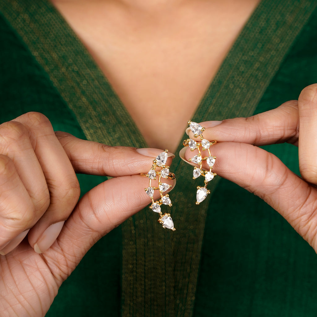 Details Size : Earring L-1.1"XW 0.2" Stone Setting : Zircon String(s) : Drop(s) : Finish : 22k Gold Plated Finding...
