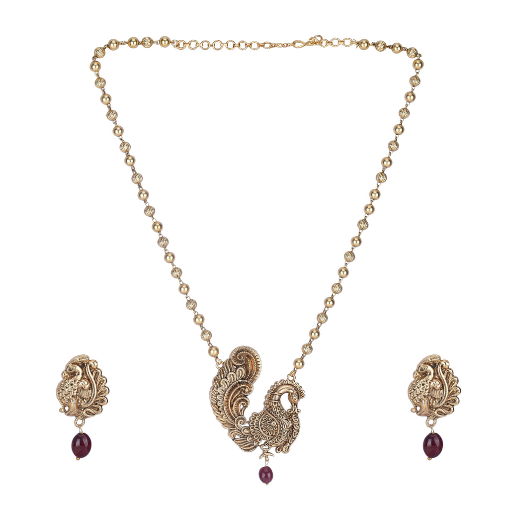Details Size : Necklace L-20" X W-1.3" Earring L-1" X W-0.7" Stone Setting : Ruby String(s) : Drop(s) : Finish : Gold Plated Finding : Hook Link& Push Back Art Karat Jewelry is plated with 22k gold, studded with precious,...