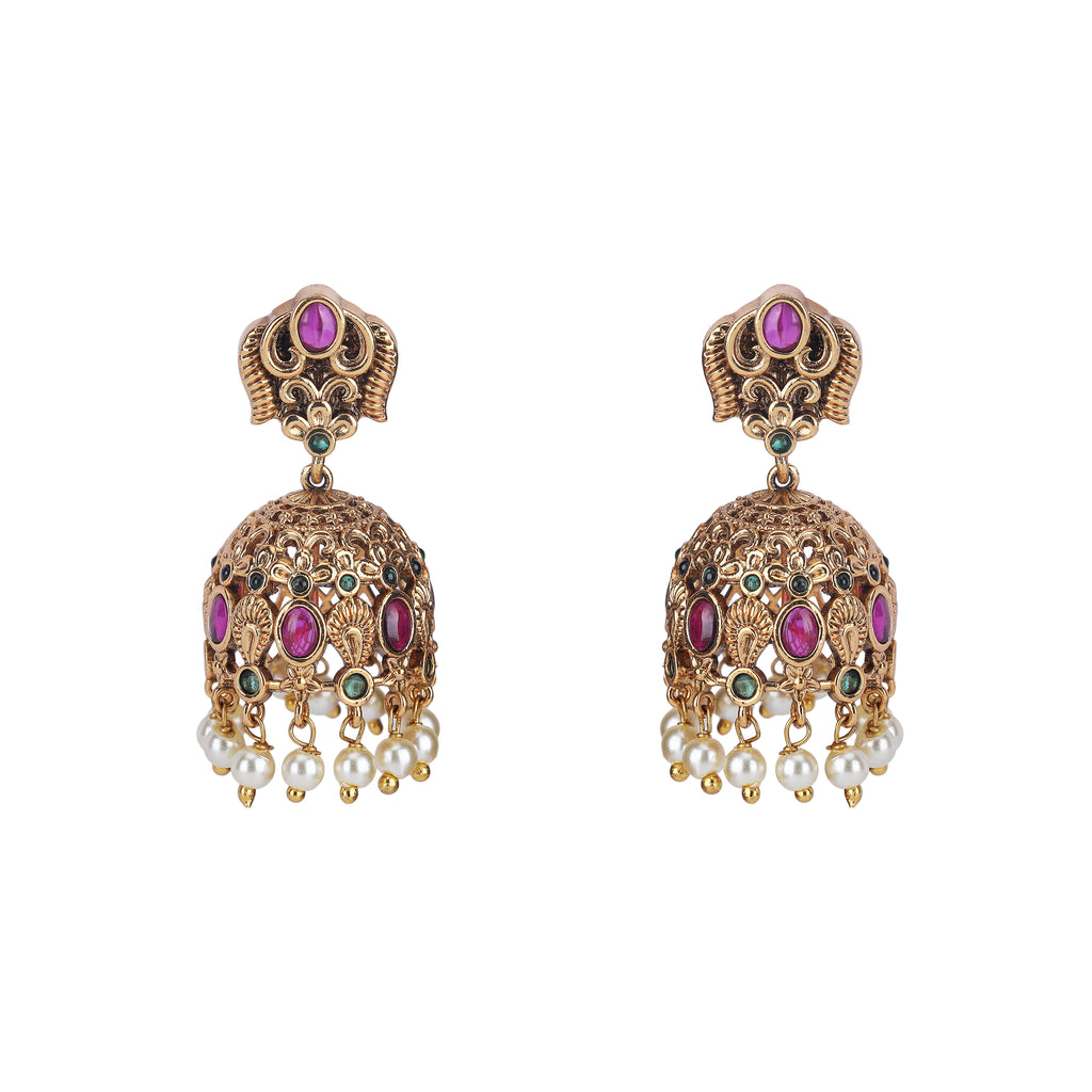 Details Size : Necklace L-23" X W-2" Earring L-1.5" X W-0.8" Stone Setting : Ruby String(s) : Drop(s) : Fresh Water Pearl Finish : Gold Plated Finding : Hook Link& Push Back Art Karat Jewelry is plated with 22k gold,...