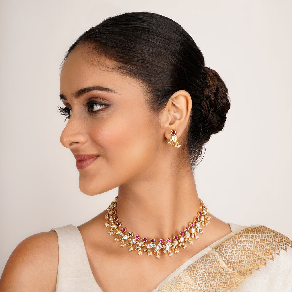 Details Size : Necklace L-9" X W-1" Earring L-1.2" X W-0.3" Stone Setting : Ruby String(s) : Drop(s) : Finish : Gold...