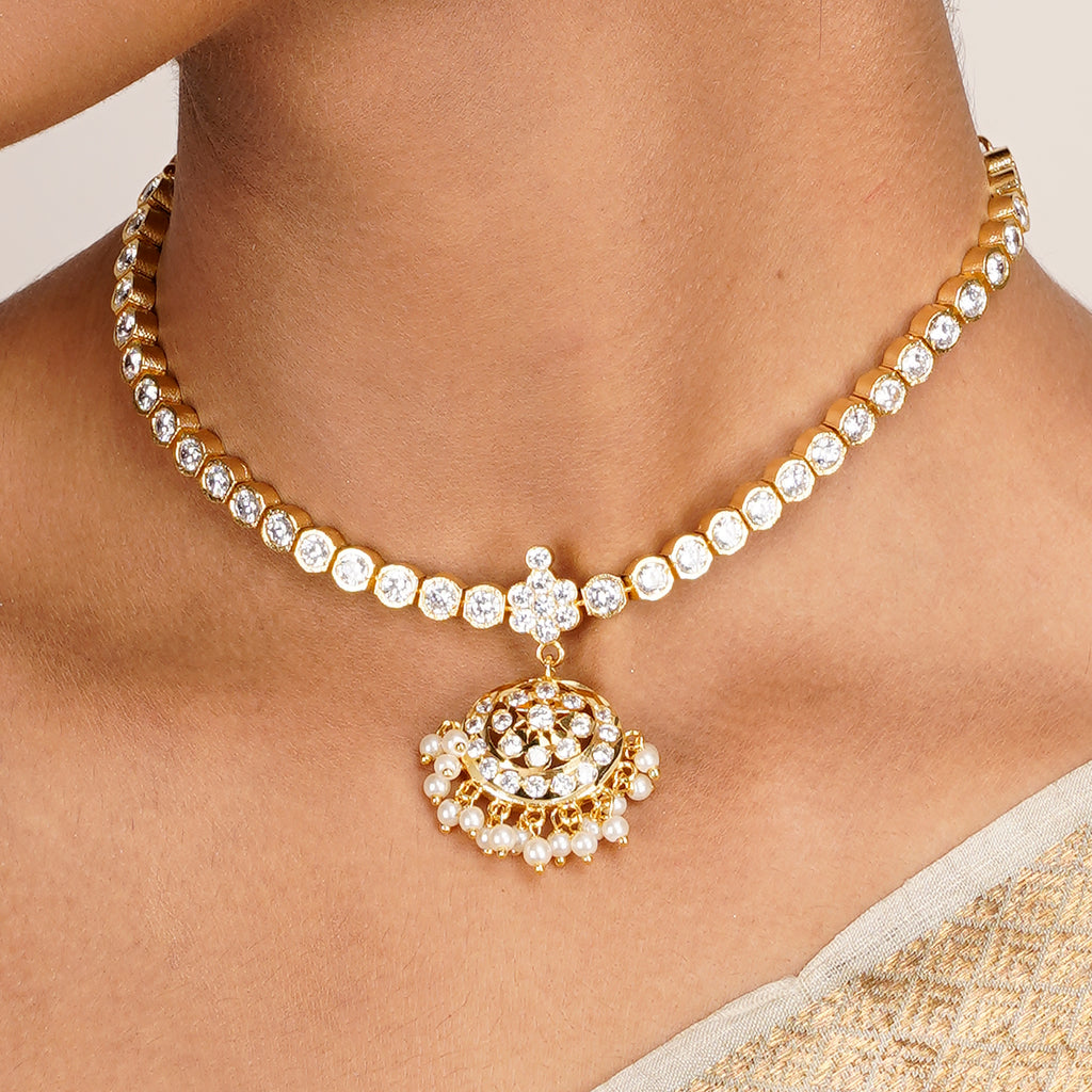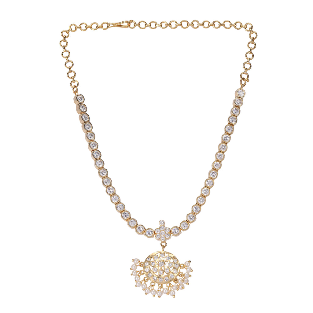 Details Size : Necklace L-9" X W-0.5" Earring L-0.7" X W-0.5" Stone Setting : zircon String(s) : Drop(s) : Finish : Gold Plated Finding : Hook Link& Push Back Art Karat Jewelry is plated with 22k gold, studded with precious,...