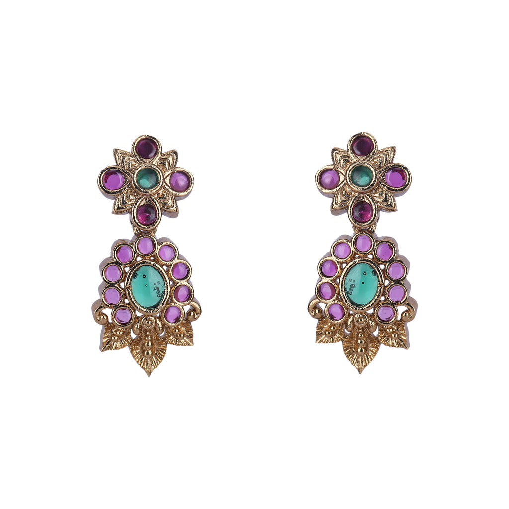 Details Size : Necklace L-9" X W-1" Earring L-1.2" X W-0.3" Stone Setting : Ruby String(s) : Drop(s) : Finish : Gold Plated Finding : Dori &Push Back Art Karat Jewelry is plated with 22k gold, studded with precious, semi-precious...