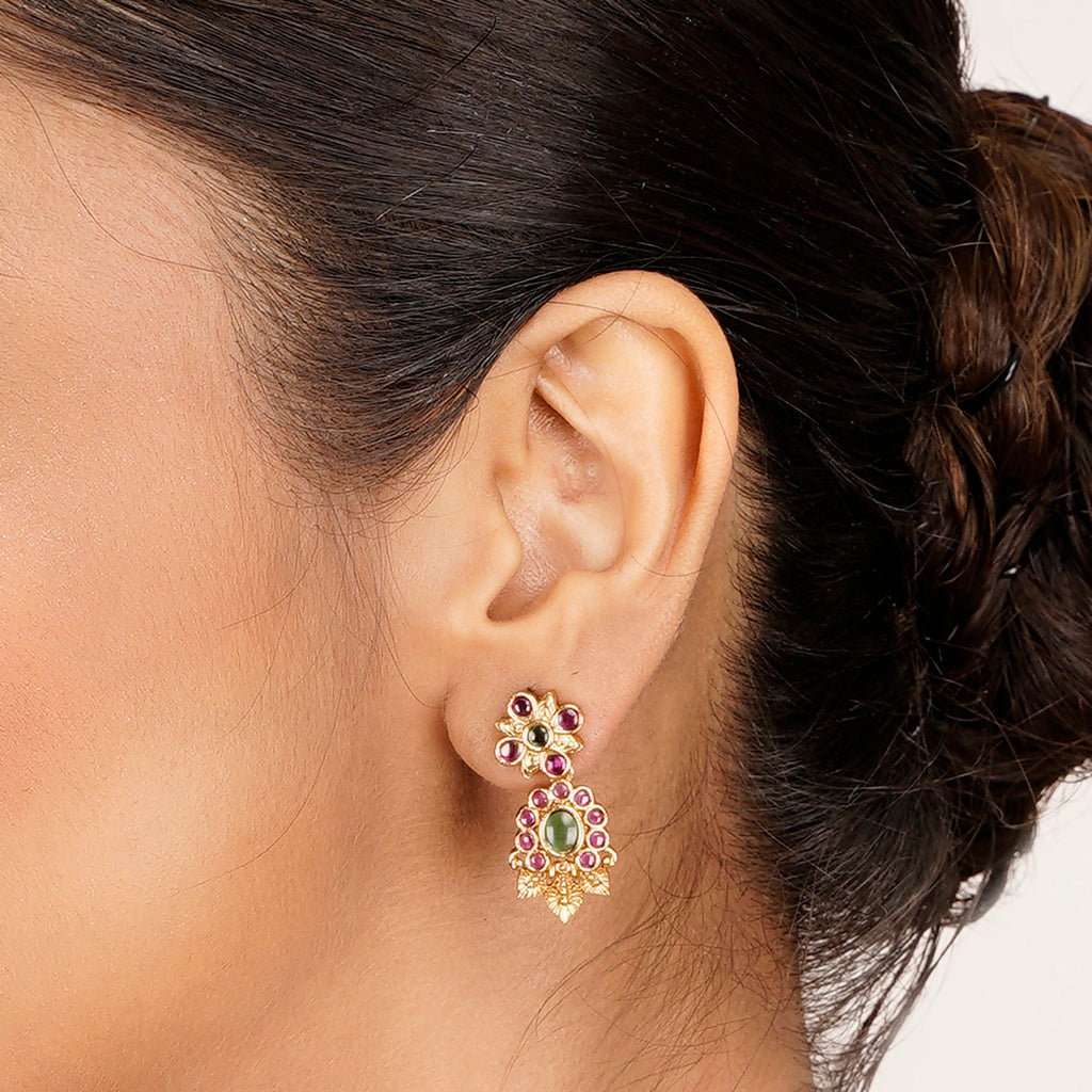 Details Size : Necklace L-9" X W-1" Earring L-1.2" X W-0.3" Stone Setting : Ruby String(s) : Drop(s) : Finish : Gold...