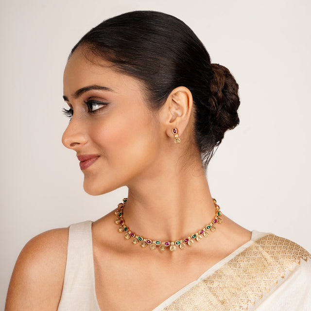 Details Size : Necklace L-21" X W-2" Earring L-1.2" X W-0.6" Stone Setting : Ruby Green Onyx String(s) : Drop(s) : Finish : Gold Plated Finding : Art Karat Jewelry is plated with 22k gold, studded with precious, semi-precious and...