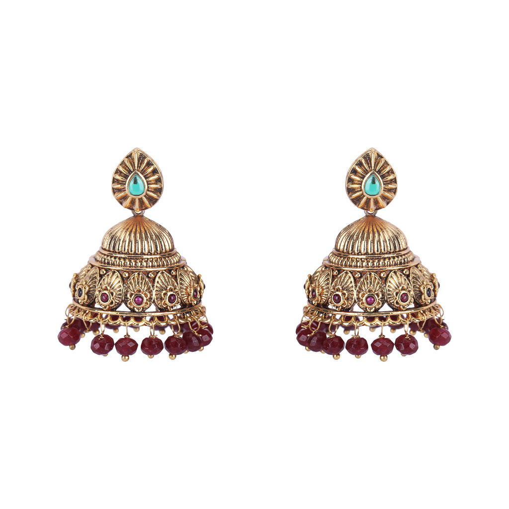 Details Size : Necklace L-9" X W-1" Earring L-1.2" X W-0.3" Stone Setting : Ruby String(s) : Drop(s) : Finish : Gold Plated Finding : Dori &Push Back Art Karat Jewelry is plated with 22k gold, studded with precious, semi-precious...