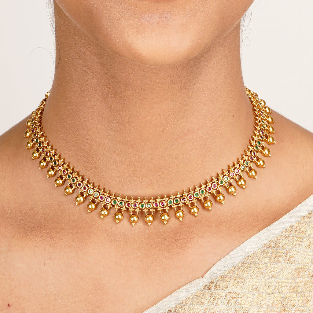 Details Size : Necklace L-9" X W-1" Earring L-1.2" X W-0.3" Stone Setting : Ruby String(s) : Drop(s) : Finish : Gold Plated Finding : Dori &Push Back Art Karat Jewelry is plated with 22k gold, studded with precious, semi-precious...