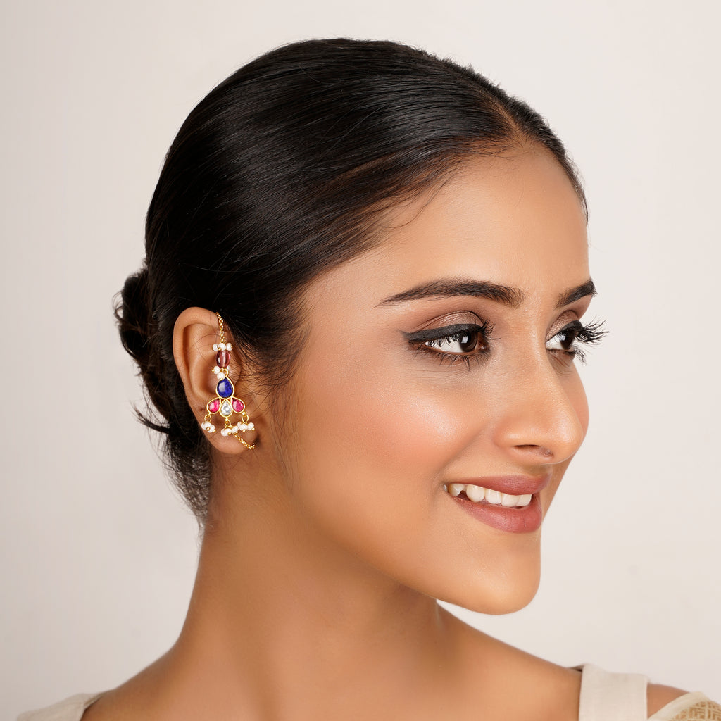 Details Size : Earring L-1.5" W- .02" Stone Setting : Kundan String(s) : Drop(s) : Fresh Water Pearl Finish : 22k gold plated Finding : chain Art Karat Jewelry is plated with 22k gold, studded with precious, semi-precious and natural...