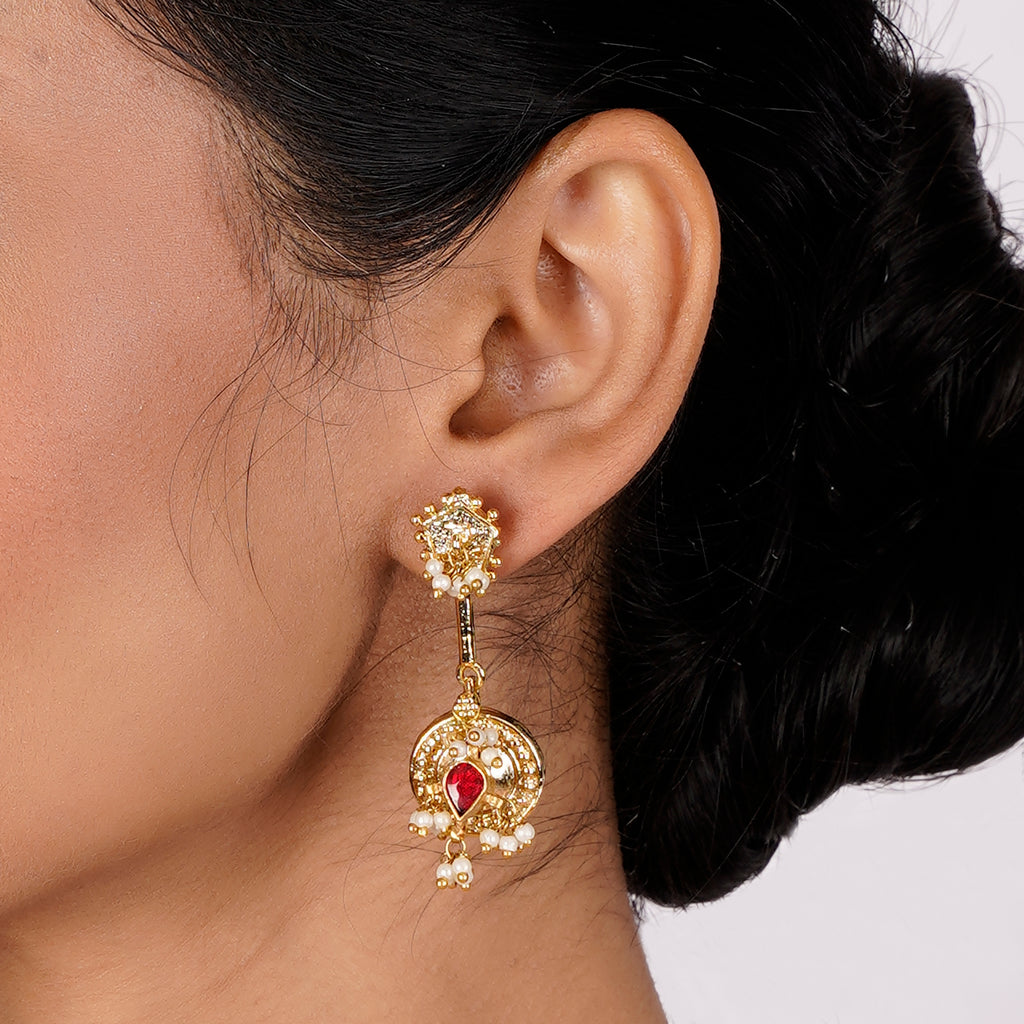 Details Size : Earring L- 3" XW-.07" Stone Setting : Kundan String(s) : Drop(s) : Fresh Water Pearl Finish : 22K Gold Plated Finding : Art Karat Jewelry is plated with 22k gold, studded with precious, semi-precious and natural gemstones....