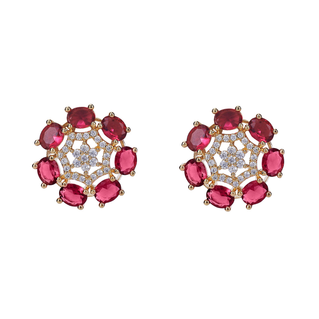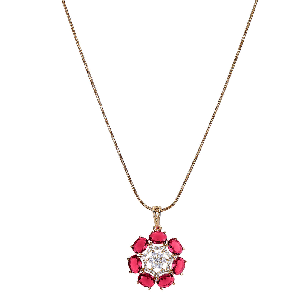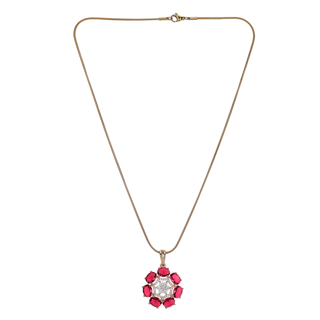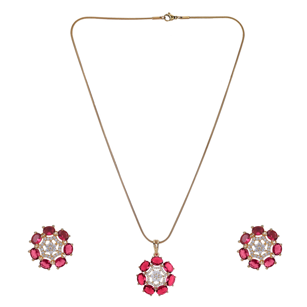 Details Size : Necklace - L20" XW0.5" Earring -L0.5" XW.05" Stone Setting : Zircon String(s) : Gold Chain Drop(s) : Ruby Finish...