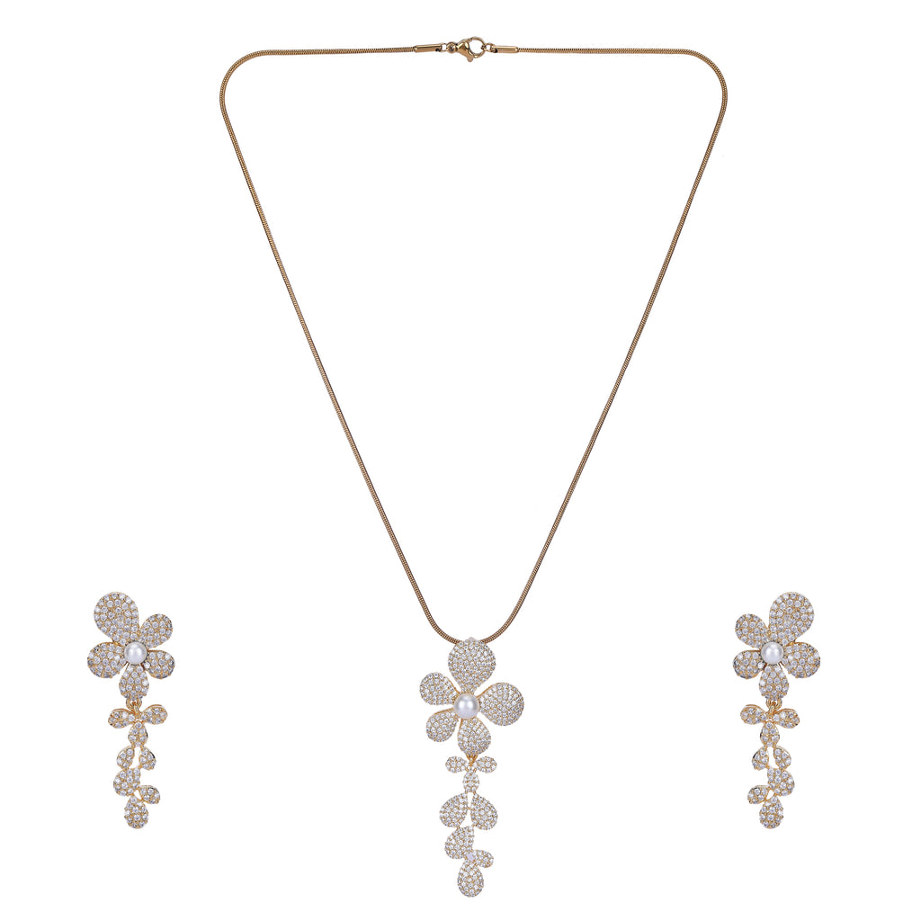 Details Size : Necklace - L19" XW0.5" Earring -L1" XW0.5" Stone Setting : Zircon String(s) : Gold Chain Drop(s) : Finish :...
