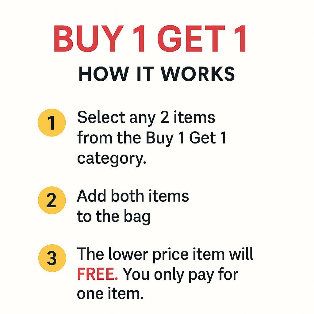 BUY ANY 2 ITEMS from the Buy 1 Get 1 category. GET 1 ITEM FREE!